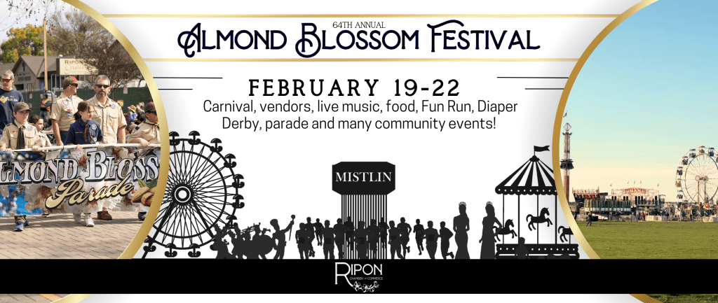 The Almond Blossom Festival is always the last FULL weekend of February with this year’s dates ranging from Thursday, February 19th- Sunday, February 22nd, 2026. There are many events that happen around Ripon that weekend, but the festival itself is put on and run by the Ripon Chamber of Commerce. Chamber events include- The Miss Almond Blossom/Miss Ripon competition (see Miss Ripon Page for more information), the carnival at Mistlin Sports Park, the vendor fair at Mistlin Sports Park, the Fun Run, the Almond Blossom Parade, and the Diaper Derby.