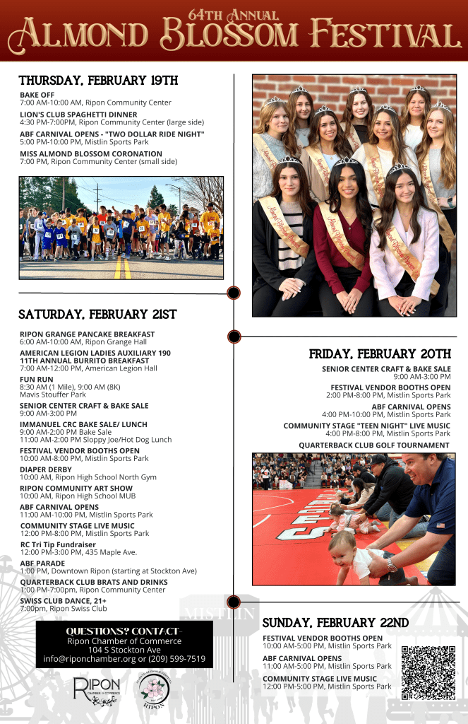 We are proud to present the 64th Annual Almond Blossom Festival, held February 19th-22nd. The festival offers endless amounts of local fun from the parade through Downtown, Miss Ripon Queen Coronation, carnival, 1 mile & 8k Fun Run, Diaper Derby, Bake Off, and more! This event could not be done without the support of the community. Help carry on this cherished community tradition!