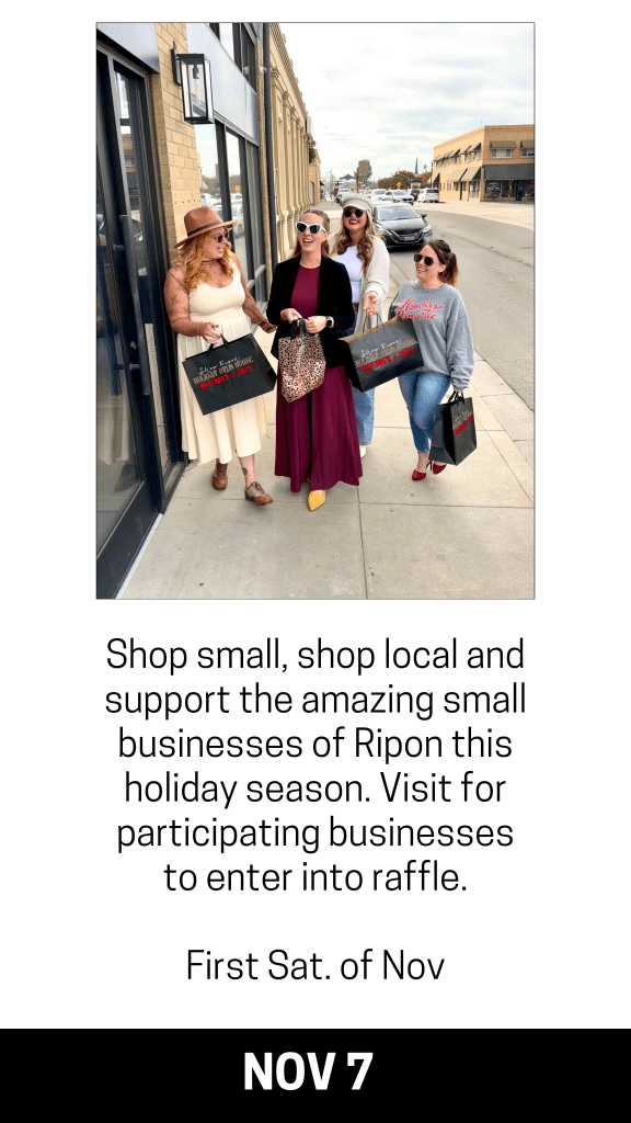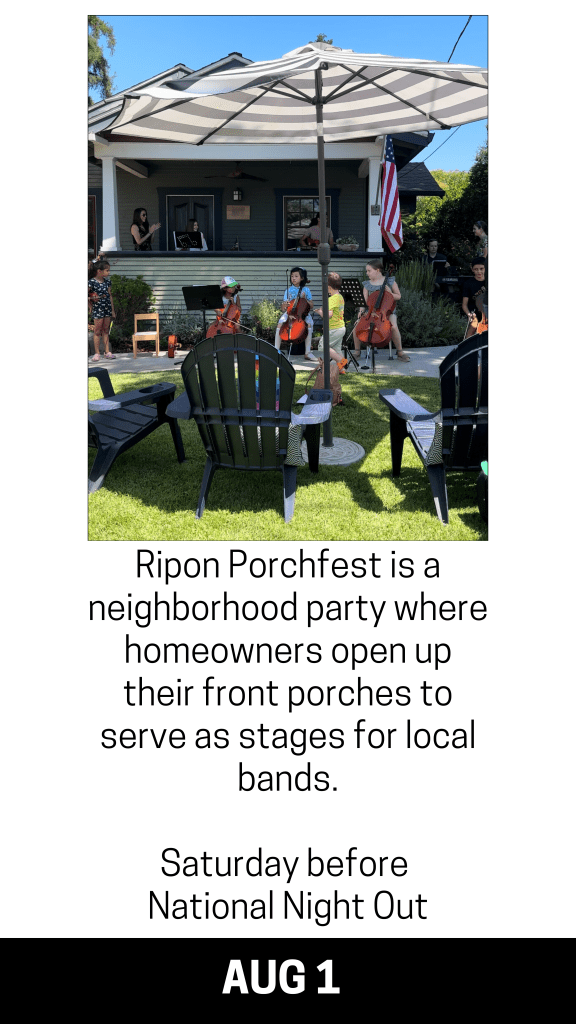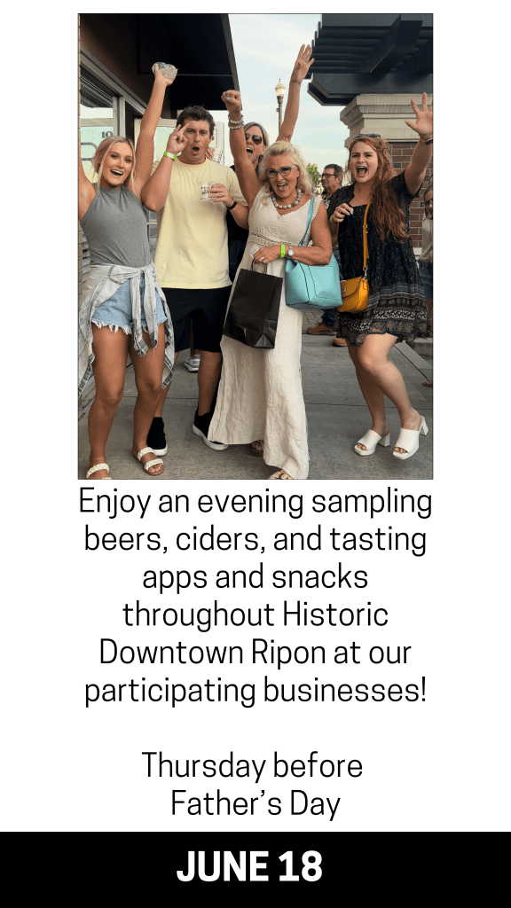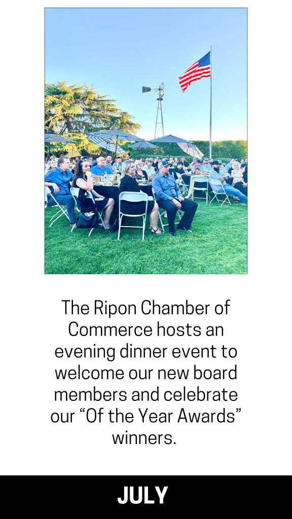 Ripon Chamber Events Almond Blossom Festival Feb. 20th-22nd 2026 Last FULL weekend of February Brews & Bites June 18th 2026 Thursday before Father’s Day Installation Dinner July 2026 Porchfest Aug 1st 2026 Saturday before National Night Out Main Street Day Oct 18th 2025 Third Saturday of October Scarecrow Fest Oct 1st-31st Shop Ripon for the Holidays Nov 1st 2025 First Saturday of November Christmas Tree Lighting Dec 1st 2025 First Monday after Thanksgiving Taste of Ripon Dec 4th 2025 First Thursday of December Christmas Light Parade Dec 11th 2025 Second Thursday of December