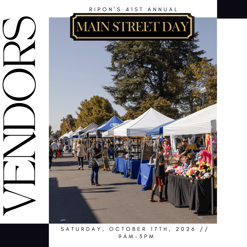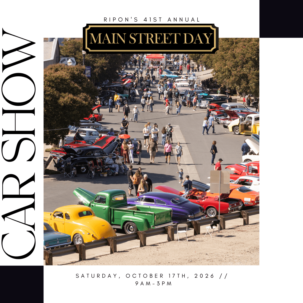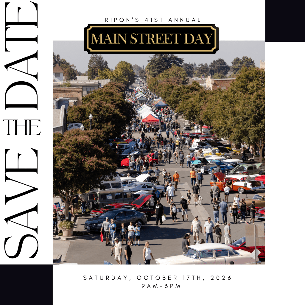 The Ripon Chamber of Commerce is proud to present the 41st Annual Main Street Day which will be held Saturday, October 17th, 2026, along Main Street in Historic Downtown Ripon from Acacia Avenue to Industrial Avenue!