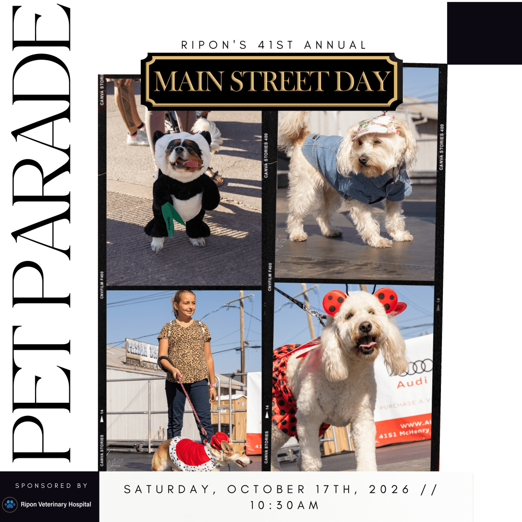 Ripon Main Street Day pet fashion show extravaganza is a highlight of the day! We look forward to seeing everyone and all their fabulous pets.